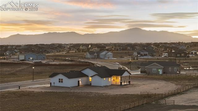 NEW HOME | Quick Close | South Facing Driveway | Half Acre Lot | IN HOME HIDDEN STORAGE | HEATED BATHROOM FLOOR - Custom Rancher with Pikes Peak Views & Luxury Finishes Welcome home to this thoughtfully designed custom property on a ½-acre lot with stunning curb appeal—stucco, stone, wood beams, and a spacious front porch. Inside, the chef’s kitchen shines with gold quartz countertops, a waterfall island, stainless appliances, and a walk-in pantry with a second oven and built-in microwave. The great room features a dramatic floor-to-ceiling stone fireplace and a 16’ sliding door leading to a covered deck with retractable TV mounts—perfect for entertaining. The primary suite blends luxury and function with dual walk-in closets (including a custom closet with chandelier and vanity), heated bathroom floors, freestanding tub, oversized shower, and private access to a hot tub pad. The main level also includes an office/bedroom and a well-appointed laundry room with sink, drop bench, and Dutch door. The finished basement offers a private guest suite, two additional bedrooms, a full bath, a large rec room with surround sound, plus a hidden flex room and cold storage. Call your agent and start packing! Meridian Ranch community is a premier master-planned golf community offers panoramic Colorado views, multiple recreation centers with fitness facilities, indoor basketball courts, NEW Indoor turf field and walking track, pools, parks, playgrounds, miles of walking trails, and Antler Creek Golf Course. Ideally located near major military installations including Peterson Space Force Base, Schriever Space Force Base, United States Air Force Academy, and Fort Carson.