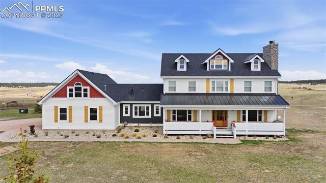Your dream property awaits! Perched on one of the highest elevation points in Black Forest, this stunning farmhouse on 20 acres is framed by sweeping views of the front range and surrounding hills! Located in District 38, this property features a gorgeous 4100+ sq foot home plus a 30x50 barn for your animals or hobbies! Zoned for horses with no HOA, quick access to Highway 83 and I-25, this spacious and inviting home has been updated both inside and out to include paint, exterior touches and landscaping, brand new carpet, kitchen updates with butcher block island, appliances, and stone countertops. All bathrooms in the home have been updated. Enjoy spreading out- main level features a living area complete with a stone fireplace, breakfast nook, formal dining, and a room that is perfect for a home office. The oversized mudroom has plenty of space for smart storage, and laundry is thoughtfully connected. Spacious walk-in pantry is located in the perfect spot for easy grocery unloading. Upstairs, the primary suite features a fireplace, 5 piece bathroom complete with a clawfoot bathtub and even a private balcony! Two secondary bedrooms and a full bath complete the upstairs space. Downstairs in the basement, a large rec-room and full bathroom provide plenty of opportunity to relax, entertain, or use as additional homeschool or work from home setup. Walkout access to the backyard makes this an ideal space for enjoyment. The home also has a fabulous BONUS loft above the garage that is perfect for guests, or multi-generational living. The loft features a living space, wet bar with beverage fridge, 3/4 bathroom, and bedroom. Enjoy your incredible Pikes Peak views from the front porch, or find shade from the sun off of the back patio. New landscaping in both the front and back make this home enjoyable year-round. Steps from the house is a perfect space for animals or hobbies. The barn can be configured to house stalls, used as a workshop, or anything else you desire!