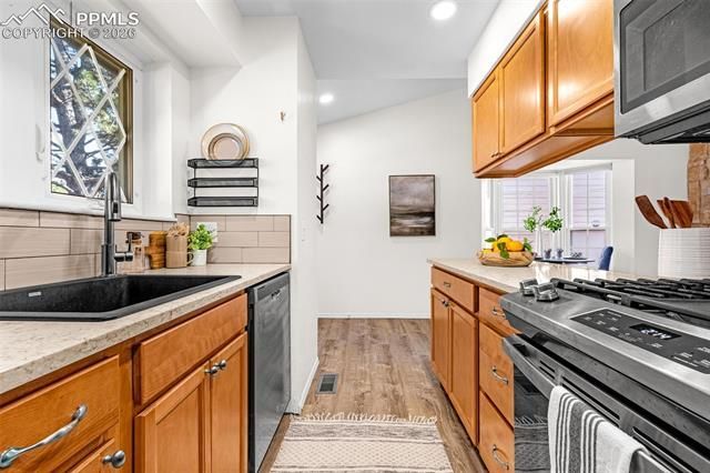 Discover this charming 1 bedroom, 1 bath townhome for sale in Colorado Springs — a fully remodeled gem that proves big style can come in a smart, efficient package. At 532 square feet, every inch is thoughtfully designed and well-utilized, creating an open, comfortable living experience that's move-in ready. Step inside to a bright, modern interior featuring quartz countertops in the updated kitchen, paired with a gas range and newer stainless appliances for effortless cooking and everyday convenience. The cozy living area centers around a wood-burning fireplace, perfect for relaxing evenings, while the spacious bedroom offers ample room to unwind. Outside, enjoy your own private back patio — an ideal spot for morning coffee, fresh air, or low-maintenance outdoor living. This completely remodeled townhome has been pre-inspected, with seller-addressable items handled and HOA responsibilities submitted, giving you peace of mind from day one. Conveniently located close to parks and shopping centers, and a short 7-minute drive to the UCCS campus. Priced competitively with freshly cleaned carpets, this updated townhome in Colorado Springs delivers exceptional value. Don't miss your chance to own this turnkey retreat!