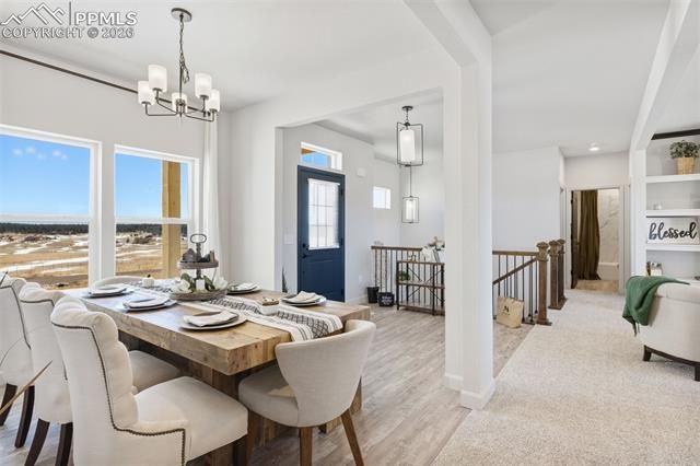Come experience pure tranquility of acreage living on a cul-de-sac all while enjoying the most spectacular views of Pikes Peak. This wonderfully designed home offers the perfect blend of serenity, creature comforts, and convenience. An oversized front porch welcomes you into the open, airy, light, and bright floor plan featuring Shaw Optimum luxury vinyl plank flooring, craftsman-style interior doors, and custom window treatments. The living room showcases built-ins and a cozy fireplace with space for a custom mantle. The kitchen is thoughtfully designed with quartz countertops, stainless steel appliances, and a spacious walk-in pantry. Just off the kitchen you will appreciate the formal dining room and the dining nook complete with a walkout to the composite deck (perfect for relaxing, entertaining, and enjoying Colorado sunrises and sunsets). The main level boasts three bedrooms inclusive of the spacious primary suite with a five-piece spa-like bathroom featuring raised quartz countertops, elegant tile finishes, soaking tub, separate shower and toilet room, as well as a walk-in closet. The two secondary bedrooms are tucked down the hallway sharing an upgraded, full bathroom. The oversized laundry room features LG washer and dryer, cabinetry, coat closet, and connects directly to the oversized garage. The walkout basement expands the living space with two additional bedrooms, a full bath, and a large entertainment/family area with a full wet bar and stainless-steel wine fridge. An expansive unfinished utility room offers abundant storage or room for future customization. Additional highlights include a 5.02 acre lot, 2024 build, stucco exterior, air conditioning, and double-pane Low-E windows. Located in Academy School District 20 and just minutes from the heart of Black Forest, I-25, 83, shopping, schools, entertainment, businesses, and the renowned Flying Horse North Golf Course, this home is a must see. Schedule your showing now before it is too late!
