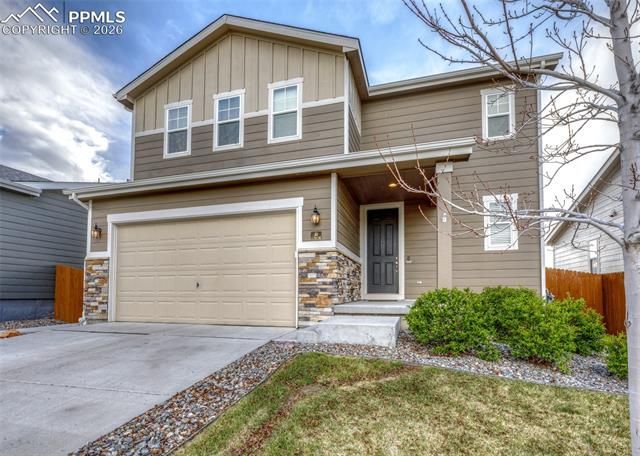 Beautifully upgraded two-story home offering 3 bedrooms, 2.5 baths, 2-car garage, and 1,910 sq ft of thoughtfully designed living space. Curb appeal shines with a landscaped front yard, mature tree, and attractive siding with stone accents. Step inside to ash-toned laminate flooring, taller paneled doors, and an open, inviting layout. The kitchen is a standout with quartz countertops, large island with seating, pendant lighting, stainless appliances, gas range, counter-depth refrigerator, dark cabinetry with crown molding, glass tile backsplash, and a pantry. Dining area features an expansive double slider leading to a covered patio with in-ceiling lighting—perfect for indoor/outdoor living. Enjoy the extended concrete patio with added railing, sun shades, retractable awning, and conduit in place to run a gas line for a fire pit. The fully fenced yard includes a storage shed and backs to open views with stunning sunsets, mountain views, and even 4th of July fireworks. Living room is open to the kitchen & dining and is prewired for surround sound with speakers in place. Additional upgrades include under-stair storage access, updated lighting, and smart home features. A convenient half bath completes the main level. Upstairs features a versatile loft, convenient laundry room with added cabinetry (washer/dryer included), and three bedrooms. The spacious primary suite includes a walk-in closet and private bath with double quartz vanity, upgraded lighting, and tiled walk-in shower. Secondary bedrooms include ceiling fans, with a full bath featuring quartz counters and tile surround. Additional highlights: Class 4 impact-resistant roof (2024), central A/C, radon mitigation system, WiFi-enabled sprinkler system, CAT6 wiring, prewired alarm system, and Ring camera included. Garage features built-in storage, workbench, cabinets, and toolbox. Located near schools with low HOA. This home combines modern upgrades, smart features, and incredible views—ready for its next owner!